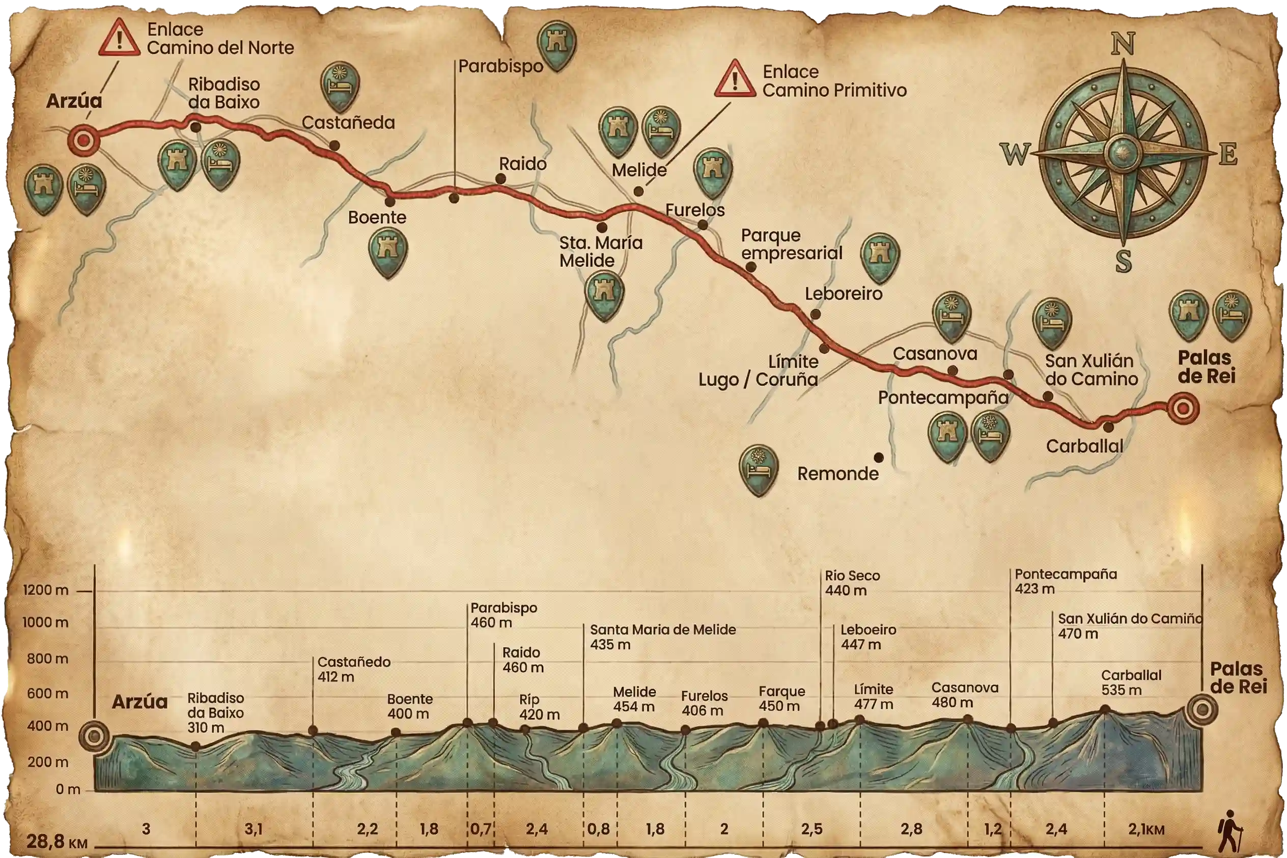 | Palas de Rei (Inicio) | 0,0 km | 0,0 km | 28,6 km |